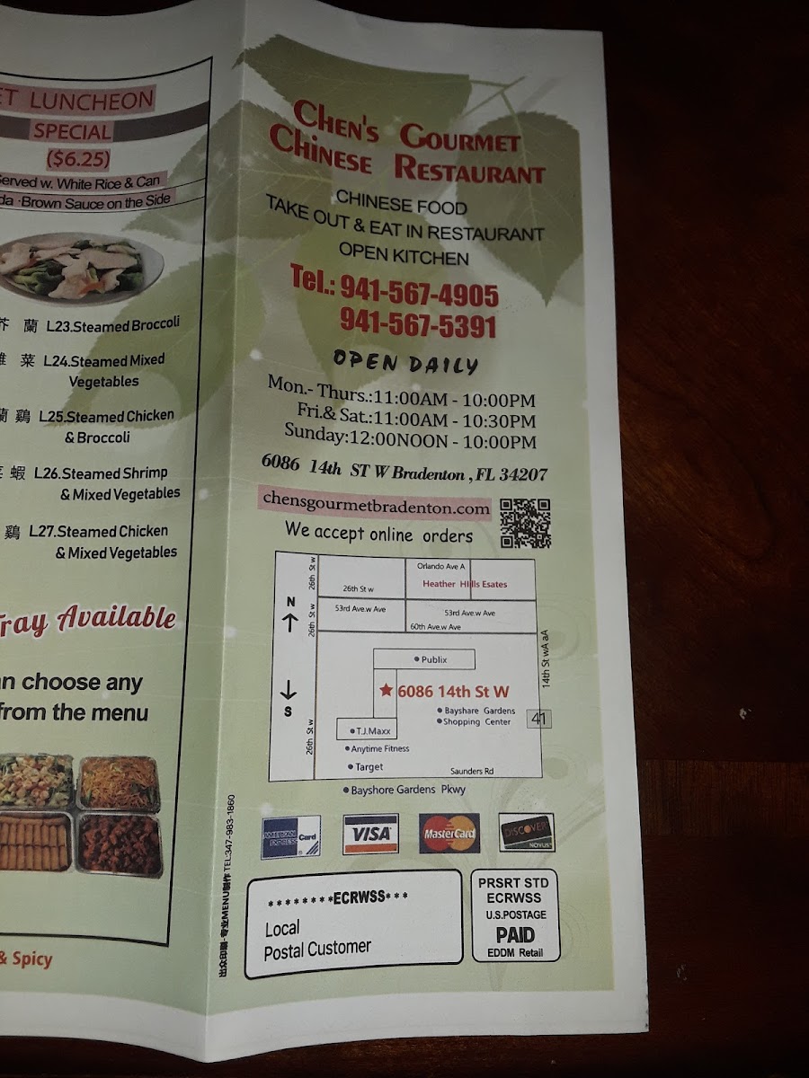 Welcome to Chen's Gourmet, your premier destination for authentic Chinese cuisine in Bradenton, FL. Nestled at 6086 14th St W, this restaurant delights patrons with its commitment to freshness and superb culinary skills. Customers rave about the shrimp with cashew nuts, perfectly cooked and paired with crisp vegetables, and the standout General Tso's Chicken, which leaves diners wanting more.